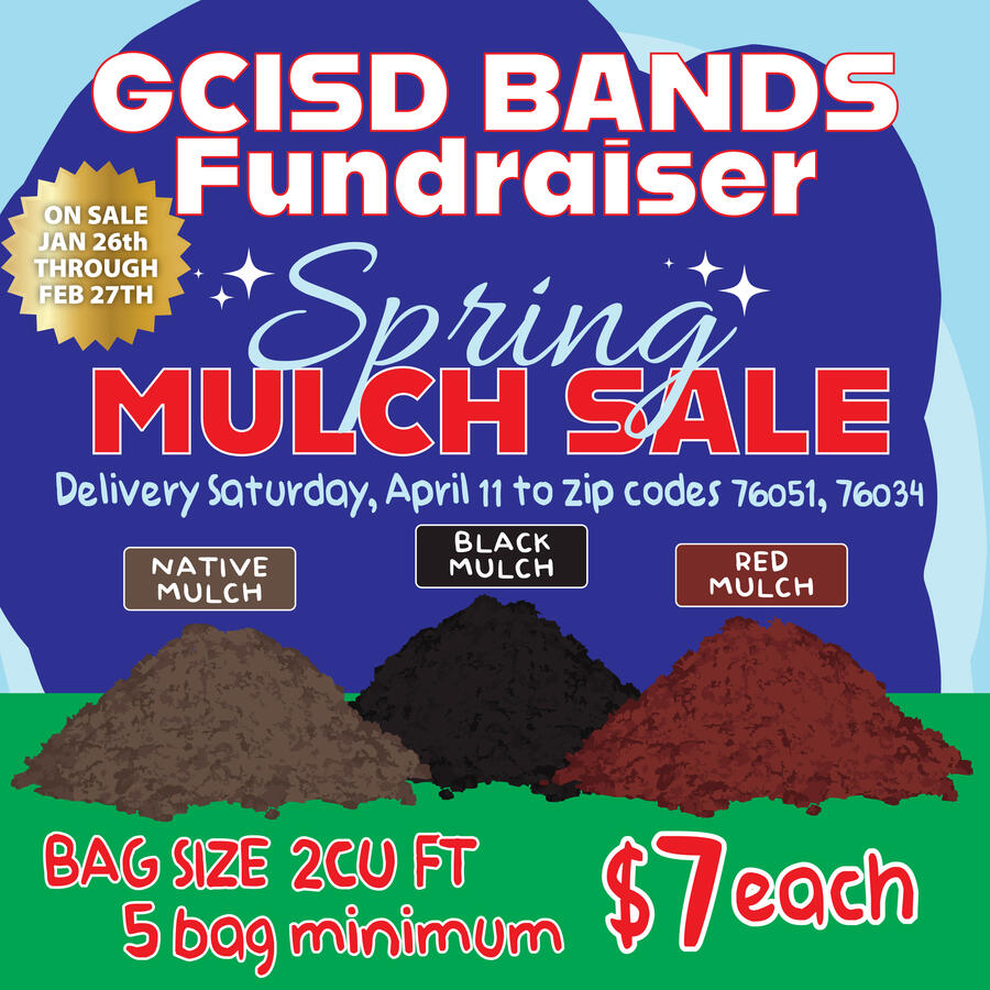 Support Our Bands While Refreshing Your Yard! The GCISD Band Program is hosting a mulch fundraiser to help support our students. Stock up for spring and make your landscaping easy!